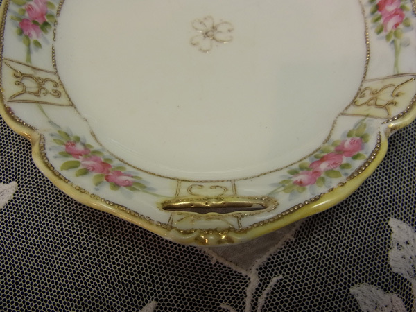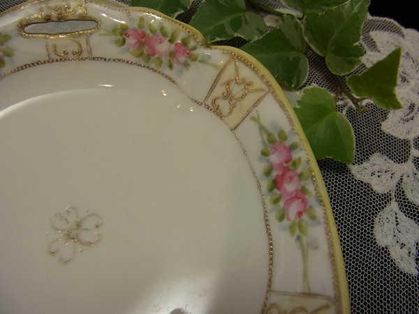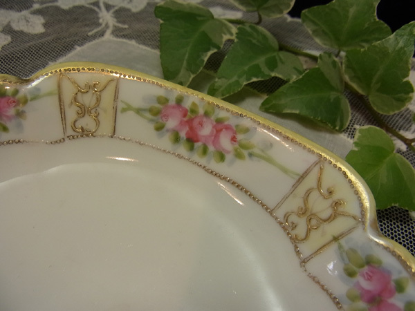 縁周りには手描きで優しいタッチのピンクの薔薇が描かれ、その合間、合間に盛り上げ細工の曲線の紋様に金彩が施されてます。