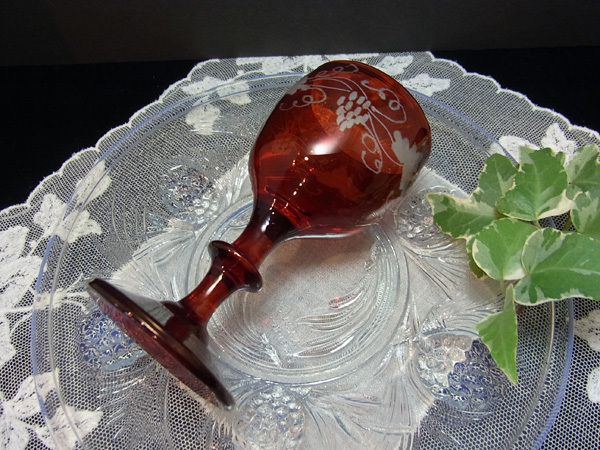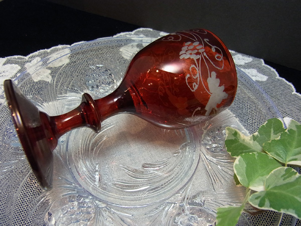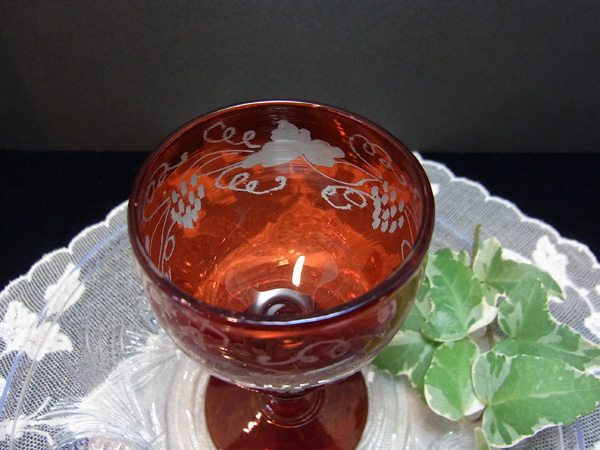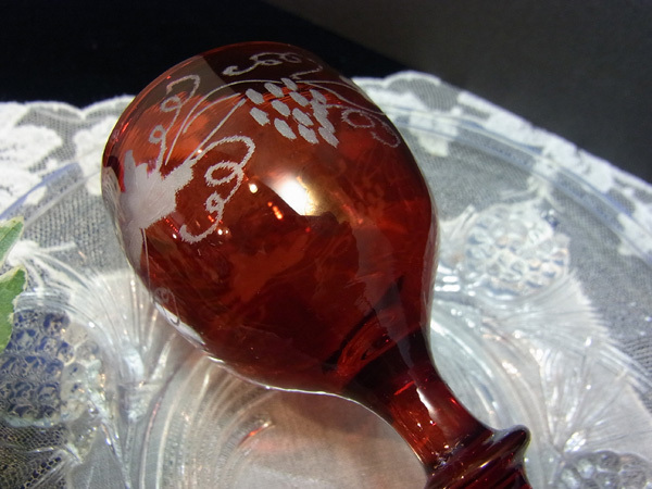 葡萄と葉、そして蔓の連なり~~のエングレーヴィングが深紅のグラスに素敵に浮かび上がります。
