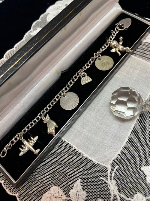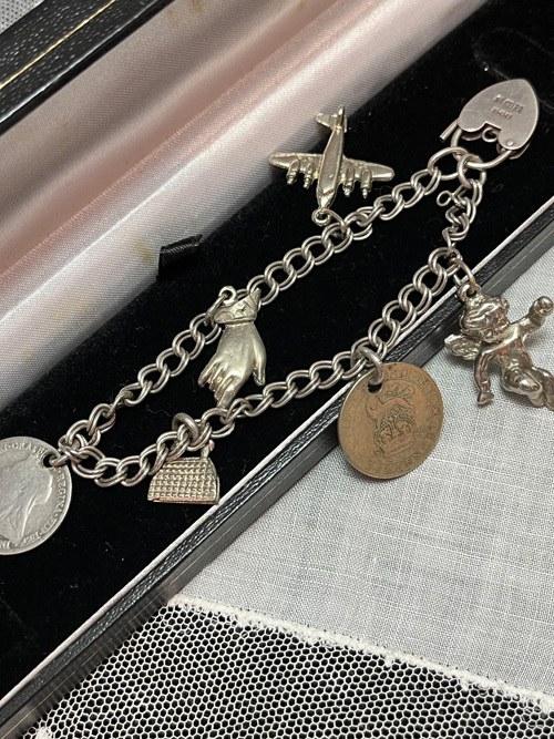 それぞれの想いで付けるチャームは幸運を願うアイテムや思い出のものが連なる唯一無二のブレスレットです♪ ダブルチェーンも素敵で程よいバランスで並ぶ楽しいチャームブレスレットです。 古い6ペンスコインはなかなか見つからないので、2個も付いているのも嬉しいものです☆