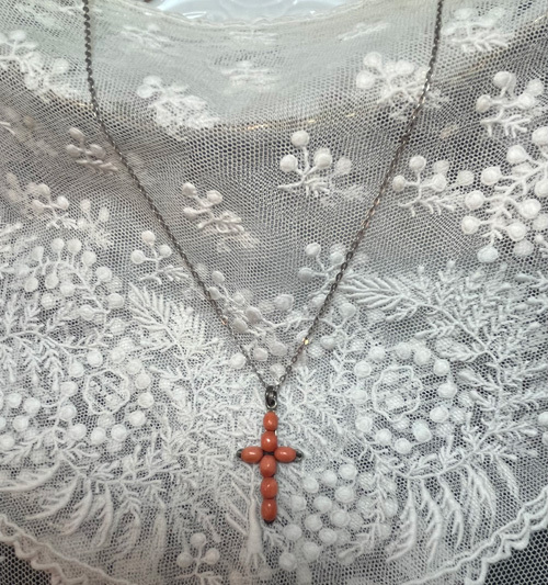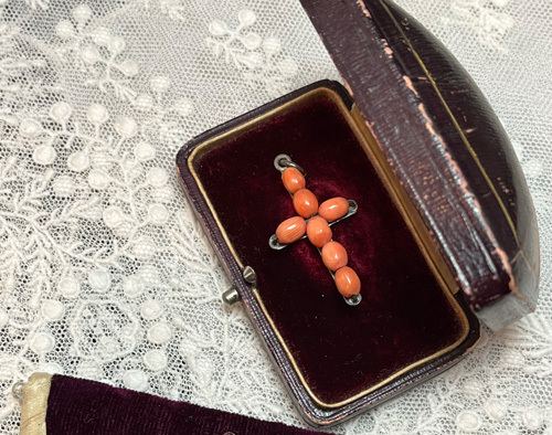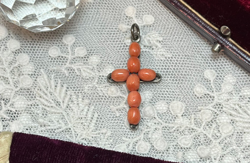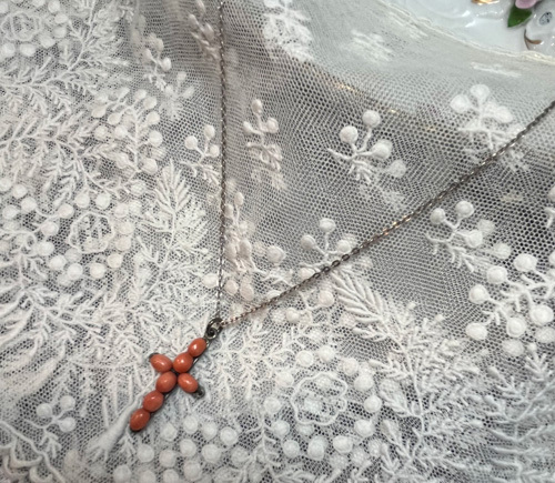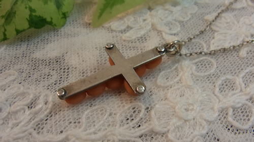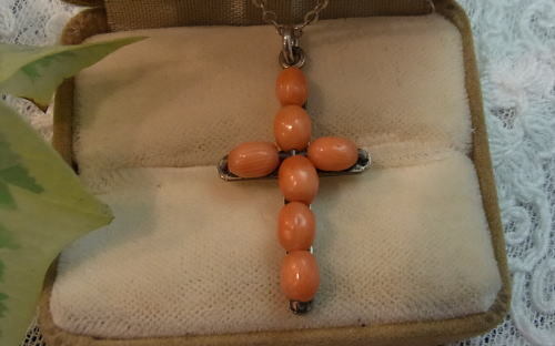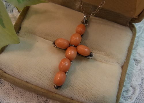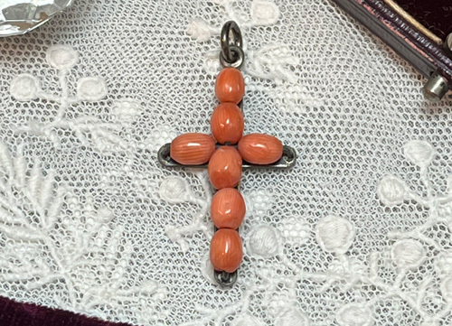 J2009:珊瑚のクロス(チェーン別)●年代:19世紀後期●サイズ:縦:3㎝ 横:1.8㎝●プライス:¥31,000 19世紀後期・ヴィクトリアンの珊瑚のクロスです。(チェーン別) この時代の珊瑚に出会うのも稀少なものです..... エンジェルスキンと呼ばれる淡いピンクよりも、少しオレンジがかった色味をしています。 行儀よく並んだ珊瑚の珠はシルバーワイヤーで繋がれ、シルバーの台座に留められています⭐️ その細工はご覧の通り素晴らしいものになっています◎ 優しい色の珊瑚のクロスはお洋服に合わせやすいですね♪ シンプルだけど手仕事の技が光る細工のクロスです☆