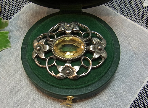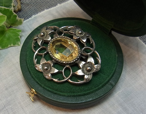 曲線が絡む凝った細工にお花が優しさを添えて、センターのシトリンガラスを引き立てています