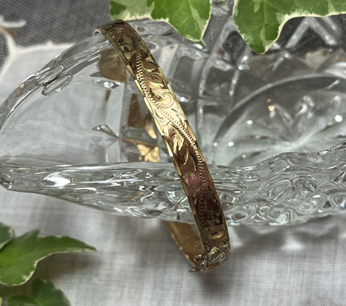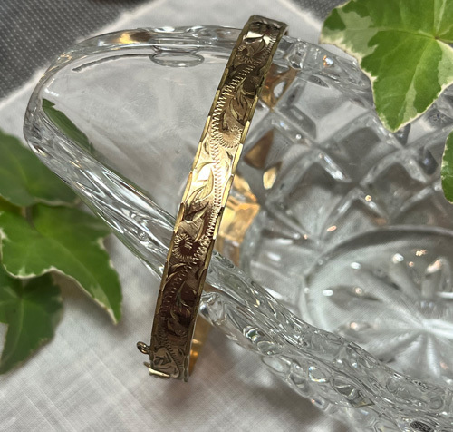 幅が0.6㎝の細めのバングルですが、半周には力強い彫り込み装飾が施されていて存在感があります。