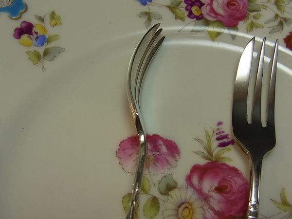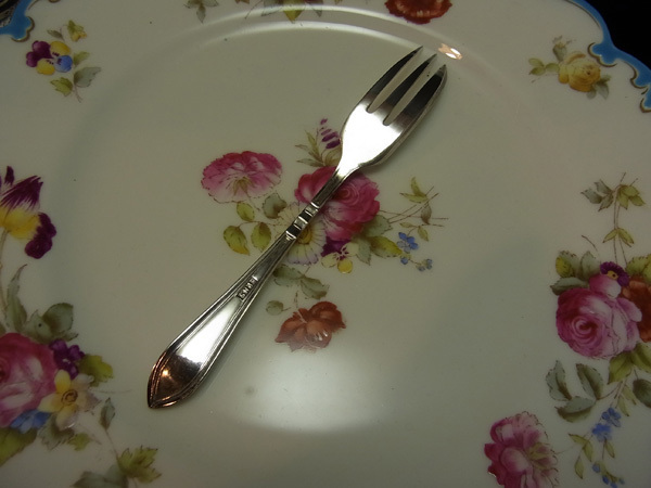 3本の刃の片側が幅広になっていて、ケーキやペストリー、パイなどカットできるように作られているので、ティータイムに一番出番の多いフォークですね♪